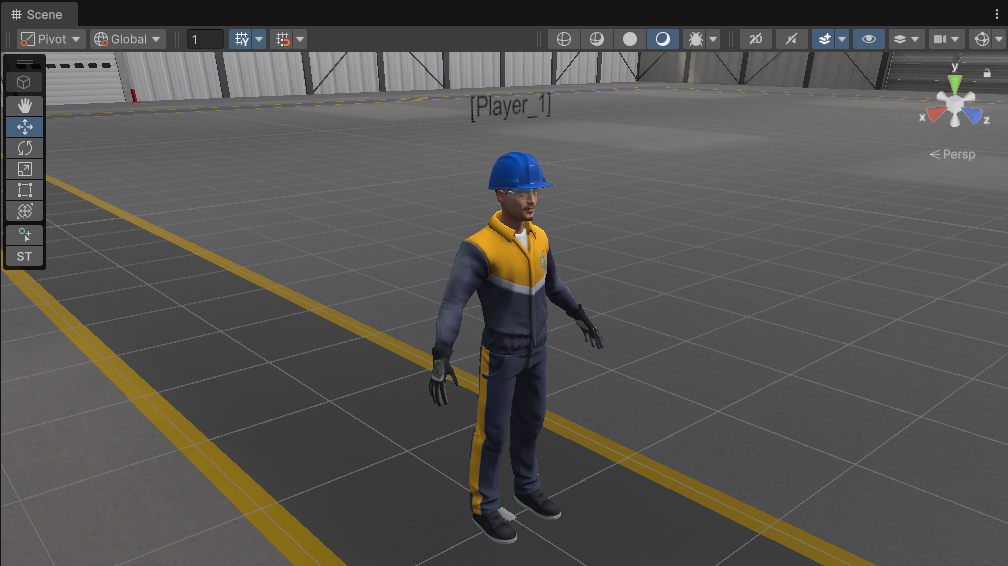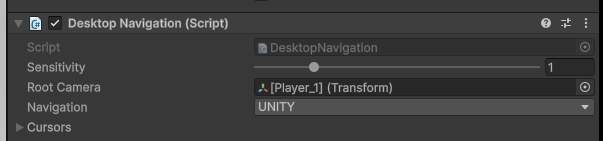 - [Player_1] is the object managing the VR camera and controllers, the hand tracking device and the avatar. Set its position in the scene (initial position in VR when simulation starts) by clicking on it and changing its coordinates (position and rotation) in the 'Inspector' tab.